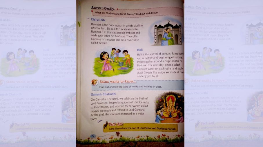 सरसरी तौर पर पढ़ने पर इन अंशों में कोई दिक्कत नहीं है। लेकिन ट्विटर पर एक ने ध्यान दिलाया कि किताब ईद का वर्णन करते हुए यह कहती है कि वे मस्जिद में नमाज पढ़ते हैं। जबकि गणेश चतुर्थी के विषय में वह लिखती है कि हम गणेश का उत्सव मनाते हैं। यह हम कौन है और वे कौन हैं पाठक की आपत्ति में कोई झोल नहीं था। उसका कहना था कि क्या इस प्रकार एक त्यौहार उनका और एक हमारा बतलाकर कक्षा में दो समूह नहीं बनाए जा रहे हैं